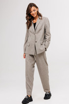 Блузон с центральной застежкой на петли и пуговицы, втачным воротником с отрезной стойкой. По переду с нагрудными вытачками, спинка цельная, по боковым швам- разрезы. Рукав втачной, длинный, с отрезной манжетой. Топ без воротника, с V-образным вырезом горловины. По переду с нагрудными вытачками. Брюки прямые, с отрезным поясом. Пояс присборен на резинку. Передние половинки с карманами. Вход в карман наклонный к боковому шву.