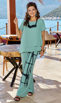 Жакет полуприлегающего силуэта, с центральной двубортной застежкой на петли и пуговицы, и потайной молнией по среднему шву спинки, без воротника, с круглым вырезом горловины, и фигурным вырезом- капелькой на уровне груди. По переду с рельефами, выходящими из проймы, талиевыми вытачками, прорезными карманами с клапанами и двумя обтачками. Спинка со средним швом, рельефами, выходящими из проймы. Рукав втачной, длинный. Брюки с отрезным поясом. В области спинки пояс присборен на резинку. Передние половинки с карманами, вход в карман наклонный к боковому шву. Застежка гульфик.