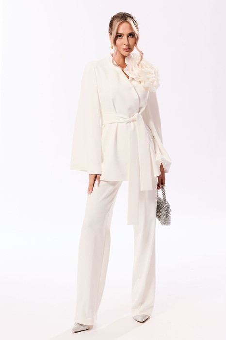 Жакет свободного силуэта, с центральной двубортной застежкой на пришивные кнопки . Цельнокроеный воротник-стойка переходит в V-образный вырез горловины. По переду с выточками и полурельефами. Спинка со средним швом, рельефами, выходящими из проймы. Рукав втачной, длинный, расширенный к низу. Пояс широкий, съемный, из основной ткани. Брюки с отрезным поясом. В области спинки пояс присборен на резинку. Передние половинки с карманами, вход в карман наклонный к боковому шву. Застежка гульфик.Съемное украшение