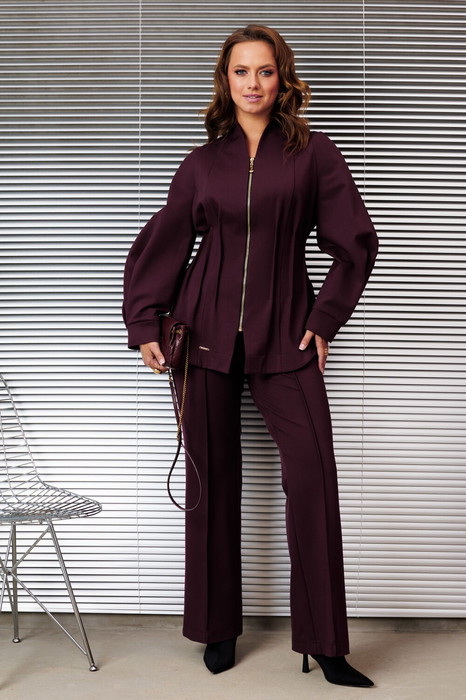 Жакет прилегающего силуэта, вырез горловины- цельнокройная стойка. Рукав реглан, внизу на манжете со складкой. По талии жакета застрочены силуэтные складки. Изделие без подкладки. Застежка на тесьму-молнию по переду.