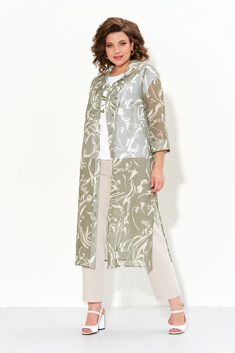 Костюм женский с брюками, футболкой и удлиненной рубашкой из шифона. Рубашка прямого силуэта со втачными рукавами и разрезами по бокам, застежка-планка на петли и пуговицы. Базовая трикотажная футболка полуприлегающего силуэта с небольшими втачными рукавами и декоративной печатью. Футболка прошла тестовую стирку при температуре 30 градусов: печать не линяет и не тяет цвет. Брюки полуприлегающего силуэта заужены к низу, притачной пояс на резинке по бокам, застежка на молнию, петлю и пуговицу, в боковых швах карманы. Уход за изделиями из шифона: