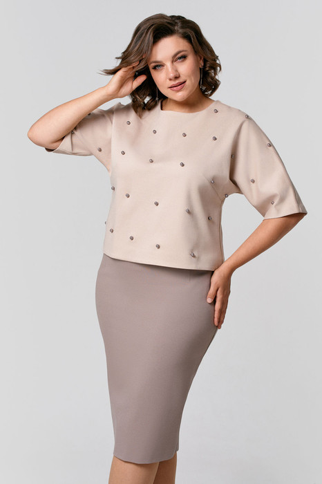 Костюм женский, состоящий из джемпера и юбки. Джемпер полуприлегающего силуэта, из трикотажного полотна средней плотности, рукава цельнокроеные; застежка на молнию по спинке, по переду декоративные бусины - жемчуг. Юбка полуприлегающего силуэта на подкладке с антистатическим эффектом; с завышенной линией талии, на поясе- обтачке, по спинке застежка на молнию, внизу шлица.
