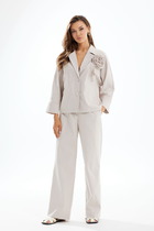 Костюм женский полуприлегающего силуэта выполнен из облегченной костюмной ткани с небольшим содержанием стрейча и состоит из жакета и юбки. Жакет без подкладки со втачными рукавами, рубашечным воротником, застежкой-планкой на петли и пуговицы. По воротнику, низу рукавов и жакета вставлена оборка из той же ткани белого цвета. Юбка полуприлегающего силуэта на хлопковой подкладке заужена к низу, пояс притачной с резинками в боковых швах и застежкой на тесьму-молнию и пуговицу. Костюм прошел тестовую стирку при температуре 30 градусов ( не линяет). Изделие соответствует размеру.