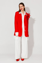Женский костюм полуприлегающего силуэта, состоящий из джемпера и юбки, выполнен из мягкого трикотажного полотна средней плотности с содержантем вискозы 70%. Джемпер по переду и  рукавам декорирован пробивными бусинами,  вырез горловины округлой формы с небольшой цельнокроенной стойкой; по спинке застежка-молния. Класичесская юбка-карандаш на трикотажной подкладке с завышенной линией талии на обтачке застегивается на молнию, сзади шлица. Костюм полностью соотвествует заявленному размеру. Пожалуйста,пользуйтесь таблицей замеров готового изделия