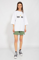 Комплект брючный 2-х предметный изготовлен из трикотажного полотна. Джемпер свободного силуэта, горловина обработана воротником – стойка. Низ переда с широкой планкой, декорированной печатью. Спинка цельнокроенная. В боковых швах обработаны карманы. Рукав спущенный, длинный. Брюки средней посадки, пояс на резинке дополнен шнуром. Брюки прямого покроя.