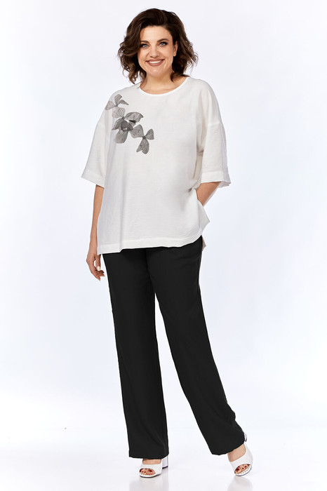 Комплект брючный изготовлен из легкой вискозной ткани с эффектом мятости. Блузка свободного силуэта. Перед с дизайнерской вышивкой, спинка с декоративными элементами по центру. В боковых швах обработаны разрезы. Рукава спущенные. Брюки прямого силуэта средней посадки. Пояс притачной на резинке. На передней части брюк обработаны карманы с подрезным бочком.
