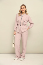 Костюм женский 2х-предметный, состоит из блузки и юбки, выполнен из натуральной ткани белорусского производства. Блузка свободного силуэта с воротником рубашечного типа и центральной застежкой на петли с пуговицами. Низ переда обработан притачной планкой. На спинке кокетка и складки. Рукава спущенные с отложными манжетами. Блузка декорирована вышивкой. Юбка прямого силуэта с притачным поясом, частично на эластичной тесьме. По переду обработаны боковые карманы, в центральном шве переда имеется шлица. Юбка на подкладке.