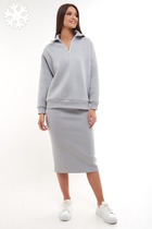 Костюм женский юбочный, состоит из джемпера и юбки. Выполнен из трикотажного полотна. Джемпер разрезной, со вставками из отделочной ткани. Горловина круглой формы. Рукава “летучая мышь”, внизу на манжетах. По низу джемпера кулиса со шнуром-резинкой и фиксаторами. Юбка заужена к низу. Пояс частично на резинке. По боковым швам декоративные вставки-лампасы. В юбке обработаны карманы. На задней части средний шов с разрезом внизу. Юбка на подкладке.