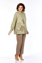 Комплект женский брючный, состоит из джемпера и брюк. Джемпер свободного кроя, изготовлен из трикотажного полотна. Горловина V-образной формы. На полочке-вышивка. Спинка цельнокроенная. Рукава спущенные, с манжетами по низу. В боковых швах-разрезы. Брюки классические из костюмной ткани. В брюках обработан пояс, частично на резинке. Застежка на молнию, петлю и пуговицу. В брюках обработаны боковые карманы. Сзади обработана кокетка.