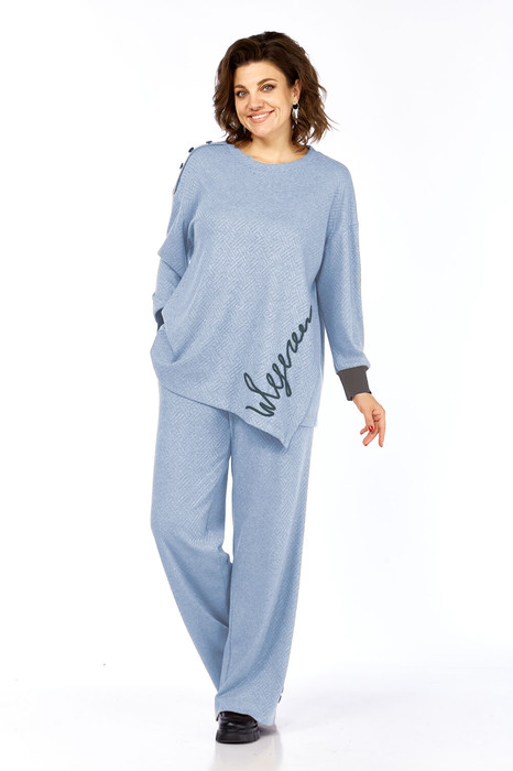 Костюм брючный двухпредметный состоит из джемпера и брюк. Выполнен из трикотажного полотна. Джемпер свободного силуэта, горловина округлой формы. Перед с асимметричным подрезом. Рукава спущенные, по низу притачные манжеты.. Джемпер дополнен вышивкой и пуговицами. Брюки свободного силуэта, с притачным поясом на эластичной тесьме. В передних деталях брюк обработаны карманы.