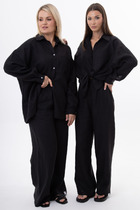 Костюм брючный двухпредметный изготовлен из трикотажного полотна. Состоит из джемпера и брюк. Джемпер свободного кроя. Горловина обработана воротником-стойкой. По переду, спинке и рукаву — вышива шнуром. В боковых швах внизу обработаны разрезы. Рукава спущенные длинные. Брюки прямого силуэта, обработан пояс на резинке. В брюках  имеются карманы.