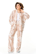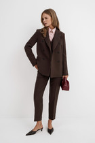 Костюм брючный двухпредметный, повседневно-нарядный, выполнен из ткани с мерцающим эффектом. Состоит из блузы и брюк. Блуза свободного силуэта. Воротник рубашечного типа, застежка центральная на петли и пуговицы. С левой стороны настрочной карман. Спинка с притачной кокеткой и встречной складкой. Рукава спущенные, по низу складки и широкая притачная манжета. Низ блузы фигурный. Брюки прямые, пояс притачной на резинке. В брюках обработаны карманы.