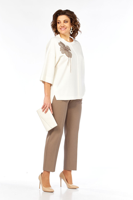 Комплект брючный 2-х предметный состоит из джемпера и брюк. Джемпер свободного силуэта, выполнен из трикотажного полотна. Горловина округлой формы обработана бейкой. Перед и спинка разрезные по центру и обработаны декоративным швом. Рукава спущенные. В боковых швах обработаны фигурные шлицы. Джемпер декорирован дизайнерской вышивкой — аппликацией. Брюки классической посадки с притачным поясом со вставками эластичной тесьмы. Застежка на петлю и пуговицу. В передних деталях брюк имеются карманы с подрезным бочком.