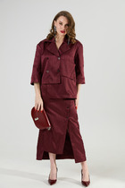 Костюм женский нарядно-повседневный, состоит из джемпера и юбки, выполнен из трикотажного полотна. Джемпер прямого силуэта. Перед цельнокроеный, дополнен дизайнерской вышивкой. Спинка с застежкой на декоративную тесьму-молнию. Горловина округлой формы. Рукава спущенные. Юбка заужена к низу. Пояс цельнокроеный на эластичной тесьме. По переду обработан ассиметричный рельеф, в котором имеется шлица. Юбка на подкладке.