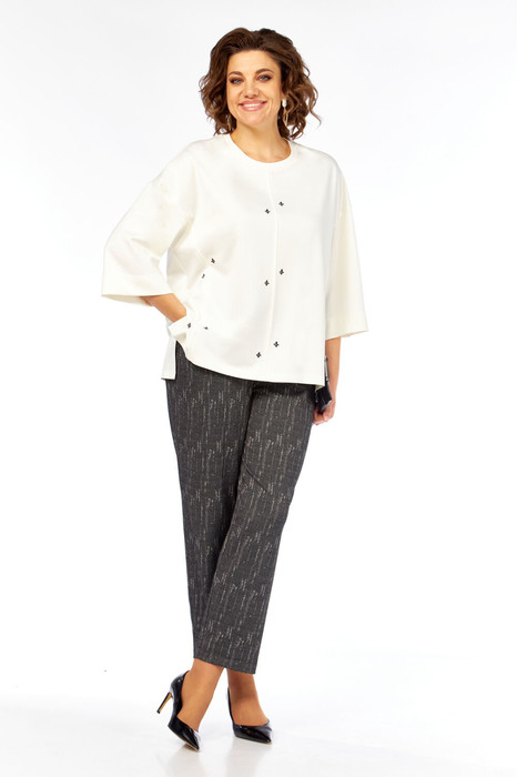 "Комплект брючный 2-х предметный, состоит из джемпера и брюк. Джемпер свободного силуэта, выполнен из трикотажного полотна. Горловина обработана бейкой. Перед разрезной по центру с боковыми рельефами. Швы отстрочены декоративным швом. Спинка цельнокроеная. Рукава спущенные с широкой подгибкой низа. В боковых швах обработаны разрезы. Джемпер декорирован дизайнерской вышивкой. Брюки свободного силуэта, выполнены из трикотажного полотна. Пояс притачной, на эластичной тесьме. По передним деталям брюк обработаны карманы с подрезным бочком. На задних деталях брюк имеются накладные карманы.
