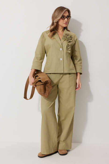Костюм женский, состоящий из жакета и брюк. Жакет без подкладки, кроя «летучая мышь», с центральной однобортной застежкой на петли и пуговицы. По переду обработаны вертикальные прорезные карманы с листочкой. Спинка цельнокроеная, слева расположен декор в виде авторской броши. Горловина V-образной формы, обработана воротником пиджачного типа. Рукав 7/8, по низу обработан широкой притачной манжетой. Брюки женские, расширенные. По переду обработана застежка на молнию, обработаны карманы с наклонным входом. На задних половинках брюк застрочены вытачки. Верх обработан широким притачным поясом (частично на резинке), застегивающимся на петлю и пуговицу. Декоративные элементы и фурнитура могут отличаться от заявленных на фото.Цвет материала может отличаться по тону в зависимости от настроек вашего устройства!