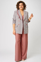 Костюм женский состоящий из жакета и брюк. Жакет прямого силуэта на частичной подкладке длиной за линию бедра.  По переду жакета застрочена наклонная нагрудная вытачка. В нижней части полочки располагается накладной карман. Спинка прямая с отрезной кокеткой. В боковых швах располагаются глубокие шлицы. Горловина обработана втачным воротником с лацканами пиджачного типа. Застежка центральная, однобортная  на петли пуговицы.  На лацкане съемная авторская брошь.  Брюки зауженные к низу. По переду Обработана застежка на «молнию» и наклонные карманы с отрезным бочком. Верхний срез брюк обработан притачным поясом на частичной резинке.