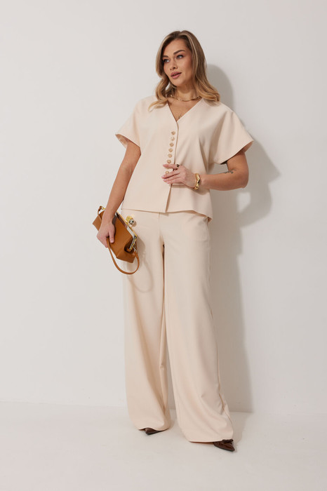 Костюм женский, состоящий из жилета и брюк. Жилет прямого силуэта на подкладке со спущенной линией плеча длиной до линии бедра. Спинка с центральным швом. Горловина V-образной формы обработана подбортом с обтачкой. Застежка жилета центральная на  декоративные пуговицы. Брюки женские, прямого силуэта. По переду обработана застежка на молнию. Карманы наклонные с отрезным бочком. На задних половинках брюк застрочены вытачки. Верх обработан широким притачным поясом (частично на резинке), застегивающимся на петлю и пуговицу