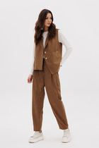 Костюм женский, состоящий из жакета и брюк. Жакет без подкладки, кроя «летучая мышь» длиной до линии бедра. По переду отрезные бочки с карманами «в шве». В шве кокетки полочки располагаются клапаны с декоративными элементами и хлястиком. Спинка с отрезными бочками и кокеткой. Рукав цельнокроеный 7/8длины, состоящий из четырех частей с патой по низу , застегивающейся на петлю и пуговицу. Низ жакета обработан резинкой. Застежка центральная на отрезные планки, застегивающиеся на петли и пуговицы. Горловина обработана втачным воротником с цельнокроеной стойкой. Брюки женские, прямого силуэта. По переду обработана имитация застежки. Карманы расположены в боковом шве. На задних половинках брюк застрочены вытачки. Верх обработан притачным поясом (частично на резинке).