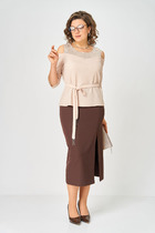 Костюм женский, состоящий из жакета и брюк. Жакет без подкладки, кроя «летучая мышь», с центральной однобортной застежкой на петли и пуговицы. По переду обработаны вертикальные прорезные карманы с листочкой. Спинка цельнокроеная, слева расположен декор в виде авторской броши. Горловина V-образной формы, обработана воротником пиджачного типа. Рукав 7/8, по низу обработан широкой притачной манжетой. Брюки женские, расширенные. По переду обработана застежка на молнию, обработаны карманы с наклонным входом. На задних половинках брюк застрочены вытачки. Верх обработан широким притачным поясом (частично на резинке), застегивающимся на петлю и пуговицу.