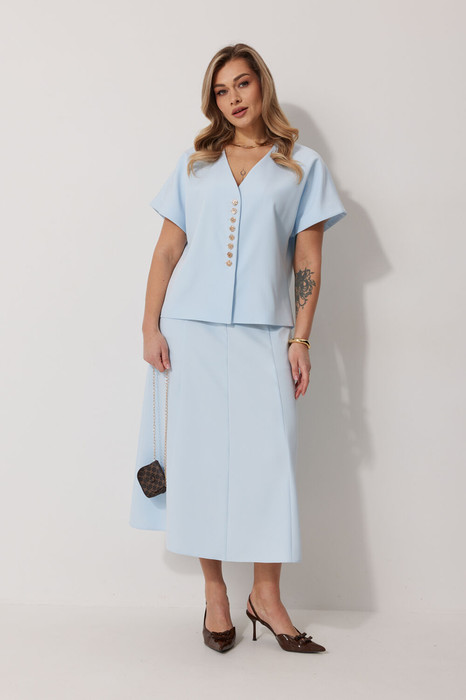 Костюм женский, состоящий из жилета и юбки. Жилет прямого силуэта на подкладке со спущенной линией плеча длиной до линии бедра. Спинка с центральным швом. Горловина V-образной формы обработана подбортом с обтачкой. Застежка жилета центральная на  декоративные пуговицы. Юбка на подкладке женская А – силуэта длиной до середины икры. Перед юбки состоит из 4 клиньев. Вверху передней части юбки располагается карман с отрезным бочком. Спинка юбки состоит из 4 клиньев. По среднему шву юбки находится застежка – молния.  Верхний срез юбки обработан обтачкой.