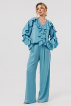 Костюм женский, состоящий из жакета и юбки. Жакет прямого силуэта без подкладки, длиной до линии бедра. По переду жакета настрочены накладные карманы с встречными складками. В шве притачивания кокетки расположен клапан кармана, застегивающийся на петлю и пуговицу. В среднем шве спинки расположена встречная складка. Рукав втачной одношовный, прямой. По низу рукава расположена пата, застегивающаяся на петлю и пуговицу. По низу жакета обработан отрезной пояс. Горловина обработана втачным воротником с лацканами. Застежка центральная , однобортная на петли пуговицы. Юбка женская на подкладке А – силуэта длиной до середины икры. По переду юбки заложены встречные складки и нстрочены клапаны с декоративными пуговицами. Спинка юбки цельная. Карманы обработаны в боковом шве юбки. По левому боковому шву юбки находится застежка – молния. Верхний срез юбки обработан притачным поясом с резинкой по спинке.