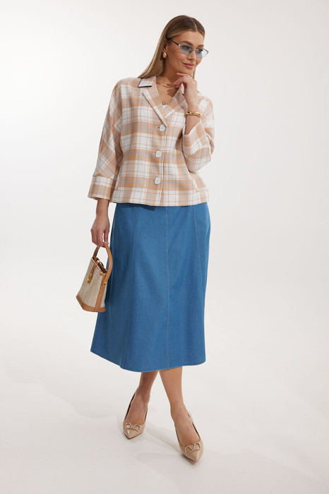 Жакет в клетку без подкладки, кроя «летучая мышь», с центральной однобортной застежкой на петли и контрастные пуговицы. По переду обработаны вертикальные прорезные карманы с листочкой. Спинка цельнокроеная. Горловина V-образной формы, обработана воротником пиджачного типа с контрастным кантом. Рукав 7/8, по низу обработан широкой притачной манжетой.