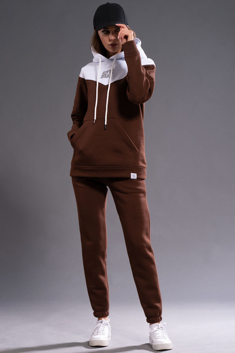 Худи с двухцветным дизайном привлекает внимание благодаря отделочной кокетке. Она добавляет неповторимости и стиля этому утепленному комплекту.