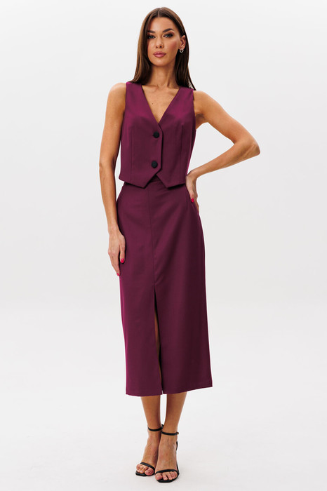 Этот элегантный костюм состоит из классической юбки-карандаша с разрезом спереди и жилета на подкладке, выполненного из высококачественной костюмной ткани. Завышенная линия талии и зауженный силуэт юбки подчеркивают достоинства фигуры, а разрез добавляет нотку современности в образ. Жилет с V-образным вырезом и застежкой на две пуговицы идеально дополняет юбку, создавая гармоничный и стильный ансамбль. Такой костюм прекрасно подойдет для офисных будней, деловых встреч и торжественных мероприятий, а благодаря разнообразию сочетаний с блузами и аксессуарами, он никогда не потеряет своей актуальности.