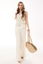 Этот костюм из блестящей пудровой ткани, состоящий из блузы и брюк, представляет собой гармоничное сочетание элегантности и современного стиля. Блуза украшена двумя нагрудными карманами, контрастными черными пуговицами и изысканными декоративными бантами, добавляющими утонченность и женственность. Прямые брюки свободного силуэта с карманами в боковых швах обеспечивают комфорт и создают элегантный образ. Этот костюм идеально подходит для создания стильного и эффектного наряда, подчеркивая вашу индивидуальность и безупречный вкус.