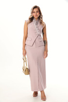 Удлинённая юбка дополняет ансамбль утончённым силуэтом. Модель с глубокими встречными складками визуально удлиняет ноги, а карманы, в боковых швах, сохраняют чистоту линий. Потайная молния по спинке обеспечивает комфорт и аккуратность, делая юбку универсальной для офиса, вечерних выходов или торжественных мероприятий.