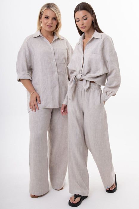 Блуза: Изысканный крой с аккуратным воротником и натуральной текстурой льна подчеркивает женственность. Легкий силуэт идеально сочетается с брюками, создавая целостный лук для офиса, прогулок или отдыха.