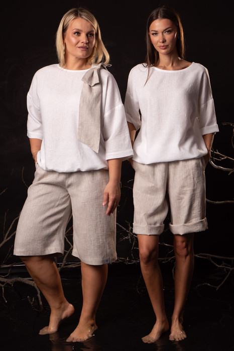 Женский костюм из льна с вискозой премиум-класса. Комплект: джемпер со съемным бантом в комплекте и шорты.