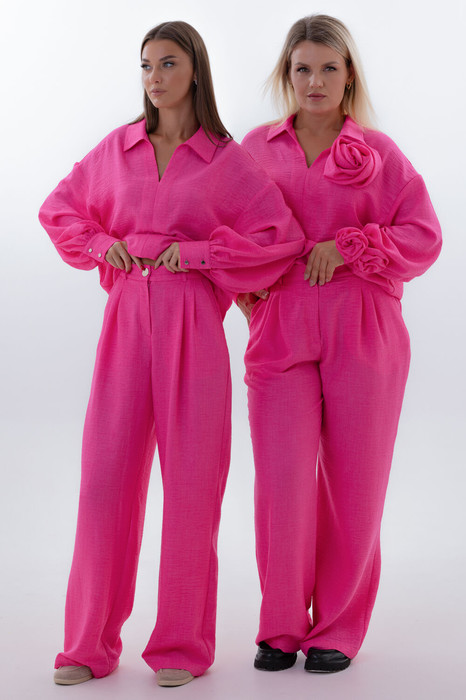 Блуза свободного кроя с отложным воротником и глубоким вырезом создает утонченную основу образа. Широкие рукава со сборкой на манжетах мягко ниспадают, добавляя пластичности каждому движению. Главная особенность — съемные декоративные цветы из основной ткани, которые позволяют разнообразить ваш образ: разместите их на груди или рукавах для романтичного акцента или уберите для лаконичной строгости.