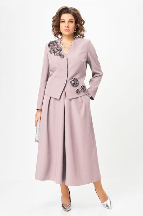Элегантный юбочный костюм, стильный и универсальный наряд для торжественных и праздничных мероприятий.  Обеспечит вашему образу максимум внимания и комплементов , благодаря безупречному подбору цвета и художественному оформлению цветочной аппликации ! Жакет с подкладкой по полочке , полуприлегающего силуэта с v образным вырезом , рукав втачной двух шовный . Юбка без подкладки,  на поясе  с боковыми резинками, расклешенного силуэта со складками по переду и боковыми карманами.