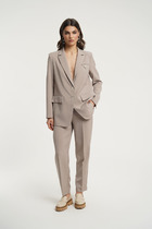 Блузон свободного силуэта, со спущенной линией проймы и укороченным втачным рукавом, длиной 26 см. Акцентной деталью изделия является обьемный волан со сборкой по центру детали. Волан со сборкой расположен вертикально и со смещением относительно центра блузона. Горловина округлая, оформлена планкой 2,8 см. Длина блузона по спинке 62-65 см (в зависимости от размерного ряда).