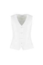 Майка прямого силуэта без рукавов. Горловина округлой формы. Край проймы и край горловины обработан окантовочной бейкой. Ширина плеча 8,5 см. Длина изделия по спинке от плечевого шва 67 см.
