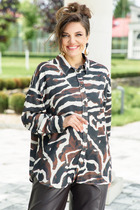 Горловина оформлена стойкой и рубашечным воротником. Застежка вертикальная на планках петли-пуговицы. Длина блузы по спинке 77 см, длина блузы переда 73 см. Рукав цельнокроенный, на спинке со складками, завершен зауженной манжетой высотой 11 см, которая может иметь положение манжет с отворотом. Длина рукава от боковой плечевой точки до манжеты 51 см.