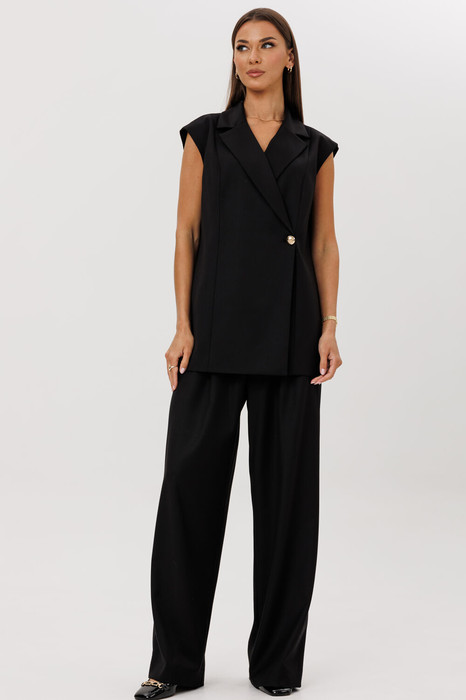 Стильный гармоничный комплект, состоящий из двубортного жилета и свободных брюк в стиле палаццо.