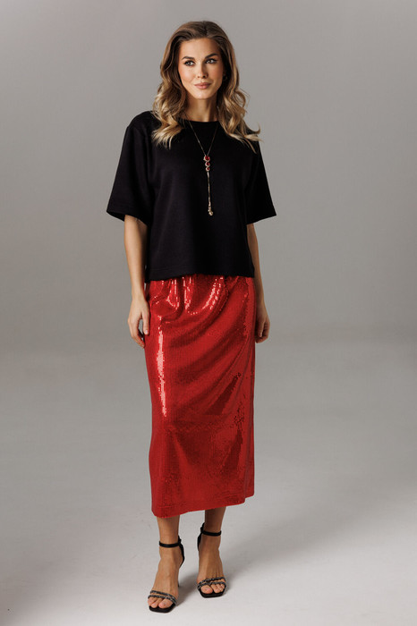 Юбка из трикотажного полотна с пайетками, прямого свободного силуэта, на трикотажной подкладке. Линия талии оформлена притачным поясом на эластичной тесьме. Длина юбки по среднему шву спинки 78 см.