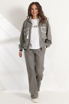Блузон из трикотажного полотна свободного прямого силуэта. Линия плеча спущена, рукав прямой на зауженной манжете. Линия плеча состоит из притачного элемента: погона. Рукав основной состоит из двух деталей, в горизонтальном шве стачивания данных деталей расположен открытый разрез. По верхнему срезу расположены стразы. При желании длина рукава может трансформироваться и отверстием выступает открытый разрез. Длина рукава, вместе с плечевой линией 73 см. Из них 21 см: длина плеча и 52 см: длина рукава. Высота манжета 5 см. На центральной части переда блузона расположены декоративные аппликационные элементы в виде ассиметричных полос из пайеток. Горловина округлая, оформлена притачной планкой, высотой 3 см. Низ блузона оканчивается притачной манжетой высотой 6 см. Длина блузона по спинке изделия 64 см.