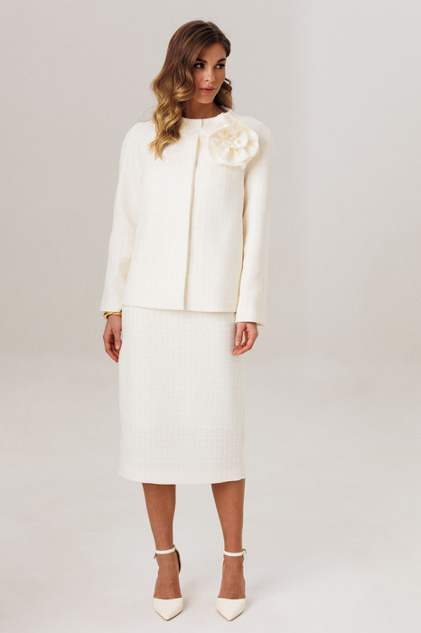 Эффектный комплект из фактурной ткани в стиле Одри Хепберн, состоящий из жакета, юбки и текстильного съемного украшения в виде цветка.