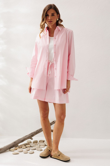 Стильный комплект, состоящий из свободной рубашки и шорт современного актуального кроя и майки-топа.