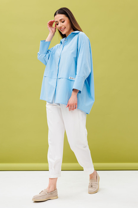Блуза рубашечного покроя с объемом oversize, со спущенной линией плеча «а-ля летучая мышь». Спинка состоит из горизонтальной кокетки и основной детали по центру с бантовой складкой для свободы движения. Спереди на основных деталях полочки горизонтальные склады-планки, глубиной 4,5 см. На складке слева расположена декоративная деталь: нашивка.
