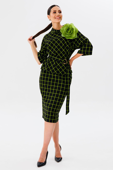 Блузон прилегающего силуэта с разрезами по боковым швам (по 7 см). На передней части изделия горизонтальные вытачки. В среднем шве спинки потайная застежка молния. Горловина обработана стойкой-воронкой высотой 4,5 см. Длина блузона по спинке от стойки 54 см. Рукав-реглан чуть расклешен к низу. Длина рукава от горловины-стойки 46 см. Юбка на подкладке прямого силуэта, чуть зауженная к низу. В среднем шве размещена потайная молния и открытый разрез. На линии талии размещены классические вытачки. Пояс внутренний, обтачной. Длина юбки по боковому шву 70 см. Высота разреза 21 см. Комплект дополнен съемным текстильным поясом на пряжке, а также цветком-брошью (съемным).
