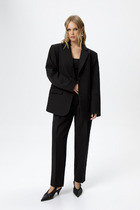 Комплект, состоящий из жакета и юбки. Жакет полуприлегающего силуэта на подкладке с рельефами по переду и спинке, с отрезным поясом по талии и накладными карманами с клапаном. Рукав втачной двухшовный длинный, воротник стояче-отложной. Застежка центральная бортовая на обтяжные пуговицы. Юбка на подкладке, зауженная к низу с притачным поясом и на резинке в размерах 50-60. Застежка в юбке на потайную тесьму-молнию в среднем шве заднего полотнища и шлицей.