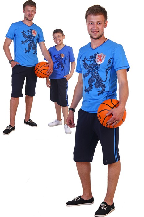 Мужской костюм футболка из кулирки + шорты из пике. На футболке спереди принт в виде гербового льва, темная прострочка, короткие рукава. Шорты с карманами, по бокам полоски в тон футболке. Может быть парой детскому костюму Тимон шорты (продается отдельно). Размеры от 46 до 60. Внимание, данный товар не подбирается по цветам и не продается в розницу!