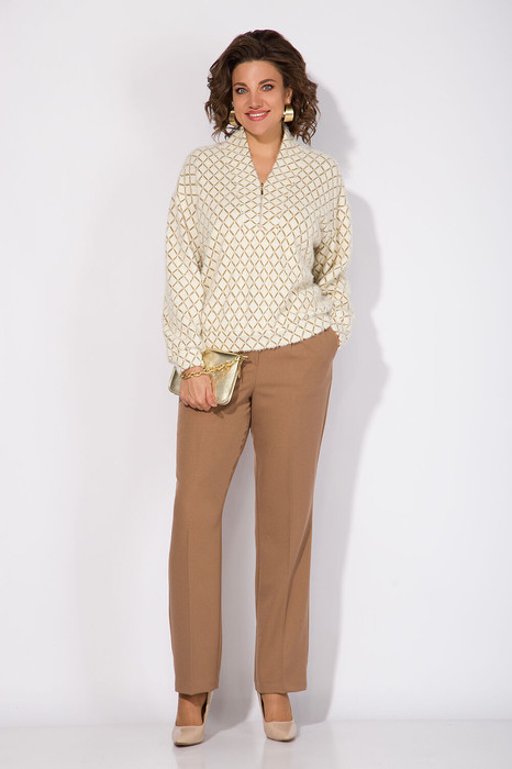 Мягкий и уютный джемпер в стиле «OLD MONEY» выполнен из трикотажа с эффектом ангоры тс рисунком. Эффектная V-образна горловина, переходящая в мягкую стойку.   Плечевой пояс спущенный, с рукавом полной длины. Низ изделия и низ рукава оформлен притачными манжетами из основной ткани. Спинка без особенностей. В комплекте классические женские брюки, со средней посадкой, прямого покроя от бедра. Застежка – брючная тесьма-молния с обработанным гульфиком.  Карманы боковые. Пояс притачной, в боковых участках вставлена резинка на свободу.  По переду заутюжены канты.  Спинка с Талиевыми выточками. Подгибка брюк –– 4 см.