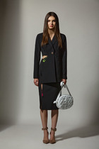Блузка полуприталенного силуэта с отрезной баской по переду по линии талии. Перед с нагрудными и таллиевыми вытачками. Спинка с таллиевыми вытачками и средним швом в который вставлена потайная молния. Горловина округлой формы обработана обтачкой. Рукав втачной с манжетой, с застёжкой на одну пуговицу. Блуза со съёмным поясом. Брюки к низу заужены, верхний срез брюк на притачном поясе, по бокам брюк вставлена эластичная тесьма, имеются шлёвки под ремень. Застежка спереди по типу «гульфик», боковые карманы с наклонным входом. На передних половинках небольшая складка, переходящая в стрелку.