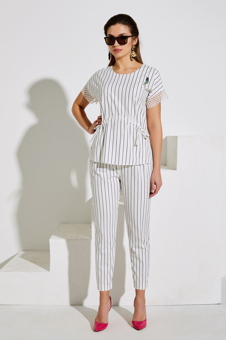 Костюм брючный. Блуза с округлым вырезом горловины, фигурной линией низа и спущенной линией плеча с притачной манжетой. По переду на уровне талии кулиса со шнурком из основной ткани. По спинке в верхней части застёжка на петли и пуговицы. Брошь входит в комплект (вид может меняться). Брюки на поясе. Передняя половинка брюк с наклонными карманами к боковому шву и бантовыми складками.